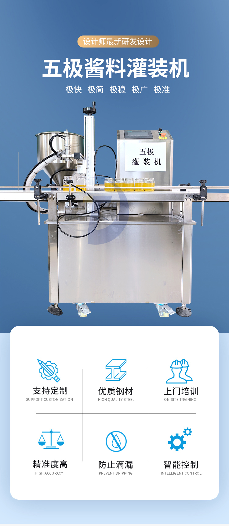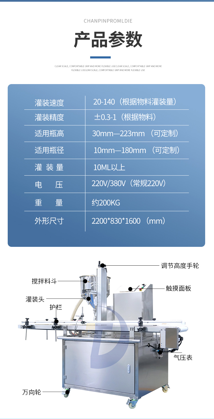 - 極快極簡極穩極廣極準 極快 灌裝速度2800瓶每小時 極簡 操作簡單 極穩24小時不停機 極廣啥啥都能灌 極準 200瓶誤差小于1克 設備突破傳統式灌裝方式,可根據瓶子高度調整灌 裝頭高度...