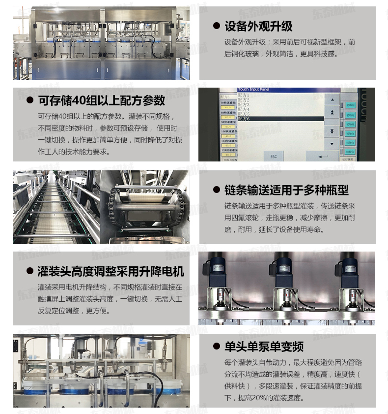 3、摒棄了傳統夾瓶口灌裝方式,采用下潛式灌裝專利下料口設計,邊灌邊提,避免了灌裝速度快產生細小水珠噴濺污染瓶口的現象產生。配合多段式快慢速灌裝,可以保障高速灌裝時全速灌裝,又可有效解決氣壓過高快速灌裝時泡沫溢瓶現象,變頻控制更精確,自我保護更安全,穩定,延長設備使用壽命。