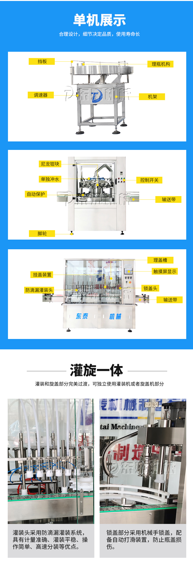 1、本橄欖油灌裝旋蓋機生產線采用機械手旋蓋,配備自動打滑裝置,防止瓶蓋損傷。